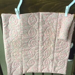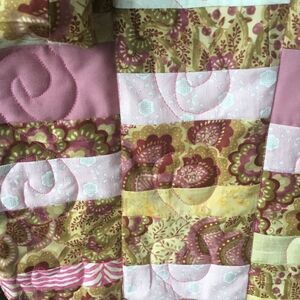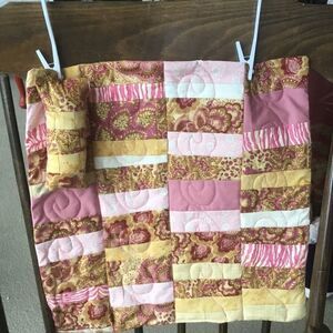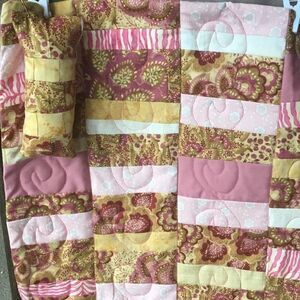 New. Handmade doll quilt in pinks and tans. This quilt measures about 17” x 16 1/2” and comes with a matching 6 1/2” x 2 3/4” pillow. All are made of new 100% cotton fabric in a non-smoking home. The back of this quilt is a small calico pink floral print and it is quilted in a swirl pattern.