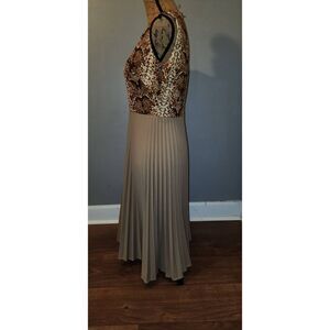 Mixed fabric pleated dress, the lined bodice is metallic snake print fabric. Hidden zipper back small tear in bodice lining see photo