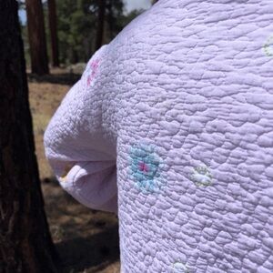 Bring history, comfort, and style together with this beautifully upcycled jacket, handmade from a vintage floral quilt. Featuring soft pastel pink tones, charming embroidered flowers, and a cozy, textured feel, this cropped jacket is a wearable piece of art. Each stitch tells a story—carefully crafted from a pre-loved quilt and thoughtfully transformed into a modern, one-of-a-kind garment.