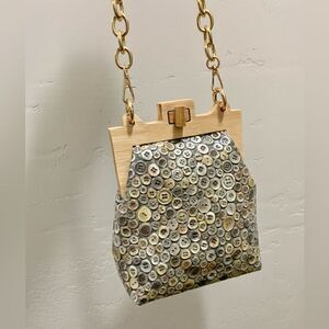 from very unique relief button pattern cowhide with wooden frame. Spacious enough inside for your phone, wallet, keys,