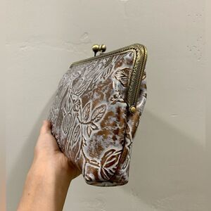 Brand new, great quality. Handmade from Italian embossed cowhide, with vintage metal frame. Includes 2 chain styles, can be used as a cross body, shoulder bag or clutch. This bag is large, holds a lot, spacious enough for your phone, large wallet, compact umbrella, credit cards, cosmetics keys & other items that you may need for a casual outing about town.
