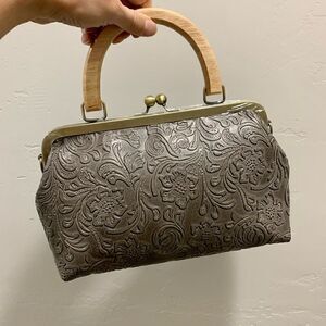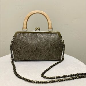 Brand new, vintage style. Handmade from full-grain cowhide embossed floral, with natural wood handle and kisslock closure. Includes metal chain can be used as a crossbody, shoulder bag, This bag holds a lot, spacious enough for your phone, large wallet, books, compact umbrella, credit cards, cosmetics, keys & other items that you may need. Accessorize as a day or evening bag, or a gift for an important someone.