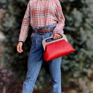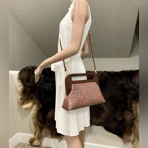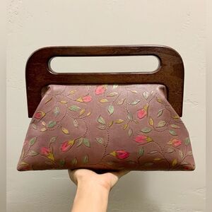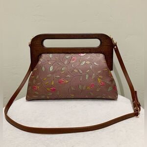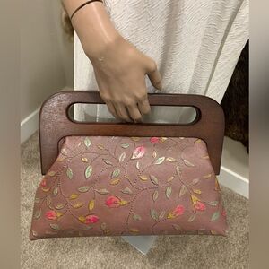 Brand new. Vintage style, great quality. Handmade from genuine leather floral embossed. with nubuck sheepskin inside. This large size wooden frame clutch holds a lot, spacious enough for your phone, large wallet, books, compact umbrella, cosmetics, credit cards, keys & other items that you may need.