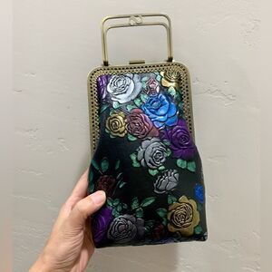 Handmade Genuine Embossed Rose Cowhide Clutch/Phone Case, Kiss Clasp/Clip Pouch