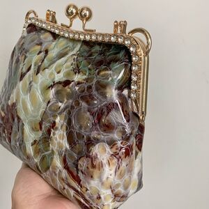 -Big one has a slip pocket inside to hold credit cards or coins, exquisite gold tone hardware metal frame with rhinestones. Reinforced bag bottom and installed with bag feet studs.