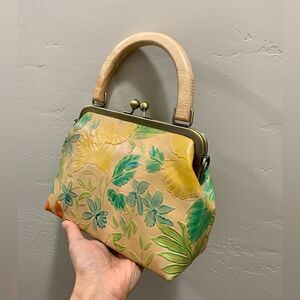 Handmade Genuine Leather Floral Embossed Wooden Handle Kisslock Bag/Crossbody