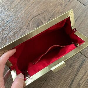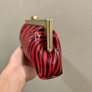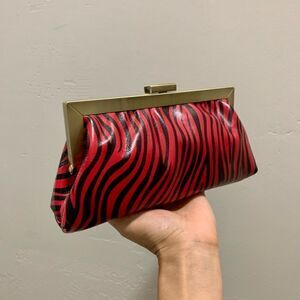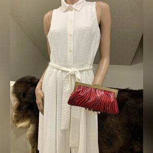 genuine leather zebra printed, with metal frame. Spacious enough inside for your phone, sunglasses, cosmetics, credit cards & other items. With chain can be used as a clutch or crossbody.