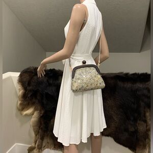 Brand new. Chic design, vintage oriental style. Handmade from very unique relief button pattern cowhide with special wood & metal frame. This large size bag can hold a lot, spacious enough for your phone, large wallet, books, compact umbrella, sunglasses, cosmetics & other items. included detachable 2 strap styles, matches your different outfits. Use in multiple ways, hand carry, wear as a shoulder bag or crossbody.
