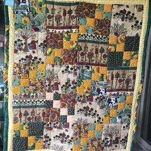 Brand new. Love sunflowers? Then this is your quilt., Features greens, yellows, red farm prints and sunflowers galore. Lap quilt measures 40” x 48” and is handmade from all new 100% cotton fabrics in a smoke free home. Reverses to a three tone yellow Ikat print. Tag includes care instructions. Quilted with love!