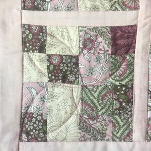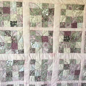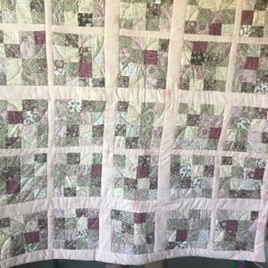 Brand new. Shade of pinks, greens and a touch of brown in all botanical prints. Handmade of 100% all new cotton fabrics in a smoke free home. This lap quilt measures 42” x 43” and features shade of pink borders.