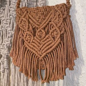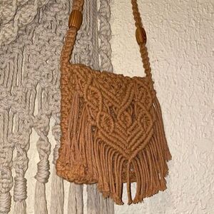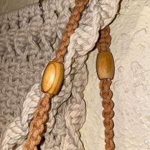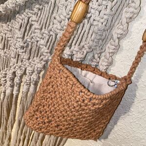 Handmade Macrame Bag Tan Light Brown Wood Beads 3 Pockets and Clip Crochet Purse