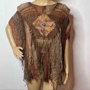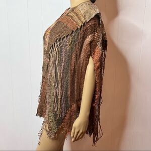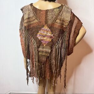 Handmade Macrame Knit Poncho Shawl Beaded Boho Bohemian Fringe Brown Gold