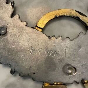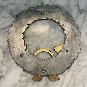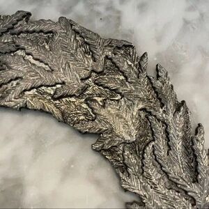This handmade wreath is in excellent pre-owned condition. It is super detailed with silver pine boughs and a gold horn and bow. The whole piece is expertly executed, and like I said, is super detailed. I have no idea how they did it, but it is really a cool piece, and one in a million. It’s a great decoration for the holidays for sure! It is approximately 6 1/2” across.