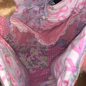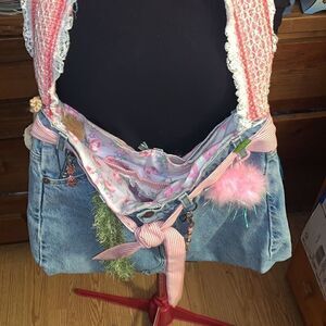 Made some years ago with all recycled stuff. The lining is a breast cancer flannel and the shoulder strap is made from my prom dress (about 50 years ago). Different little keychains and baubles adorn this. It’s gusseted at the bottom and has lots of room.