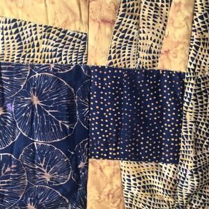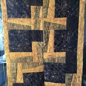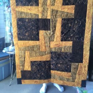 Brand new. Handmade from all new 100% cotton fabrics in a smoke free home. This beautiful batik quilt features golds, tans, blacks and browns in an outstanding combination. It measures 40 1/2” x 58” and makes a great bed accent, throw or lap quilt. The back side is a brown orange and maroon geometric print. Care instructions included.
