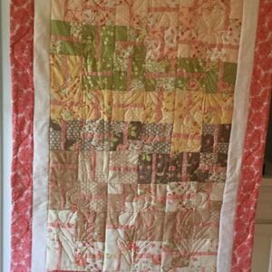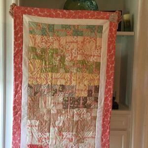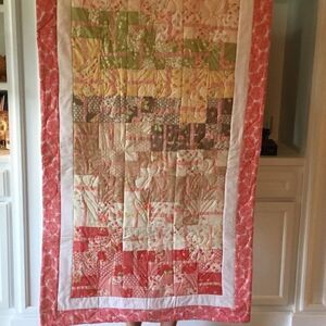 Measuring 32” x 58” this quilt is handmade of all new 100% cotton fabrics in a smoke free home. Comes with care instructions on my tag.