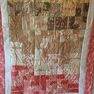 Brand new. Corals, mint green, grass green, yellows, peach and tapes in beautiful Moda brand floral and check prints in a color wave pattern. Zoom in to see the details in the fabrics. Back side is a cheery print in coordinating colors.