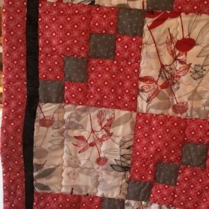 Brand new. Red, grey, black and white show up brightly in these floral and geometric prints and “play well together”. Handmade of all new 100% cotton fabrics in a smoke free home.