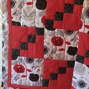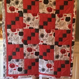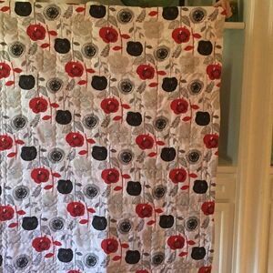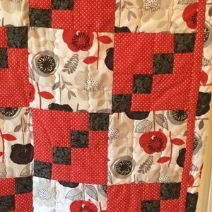 Brand new. Red, White and Greys in florals prints and white polka dot print on red all mix together in this quilt. The back side is the same large floral print as used on the front.