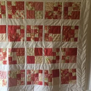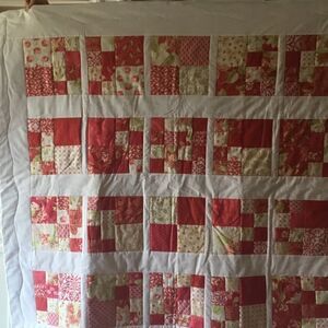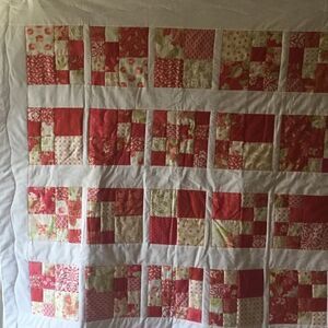 Brand new. Corals, grass greens and oranges and creams all beautiful Moda fabrics. White border accent the blocks of color. Measuring 49” x 52” this handmade quilt is made of all new 100% cotton fabrics in a smoke free home. Comes with care instructions on my tag. Back side is a coordinating coral/orange mini floral on blue print. Please zoom in to see fabric details.