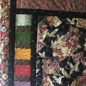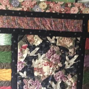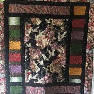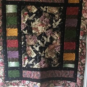 Brand new. Spectacular Oriental Cranes are featured in this special fabric with highlights of plums, greens, and pinks, all bordered in black. Please be sure to zoom in on the photos above to see the gorgeous details of the fabrics, like the gold highlights. Measuring 46” x 54” handmade from all new 100% cotton fabrics in smoke free home. Care instructions on my tag.
