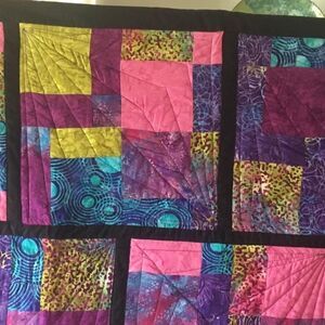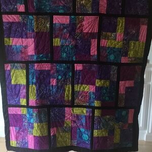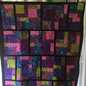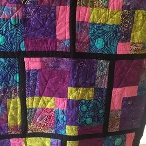 Brand new. Batiks - plums, purples, fuschias, aquas and a touch of navy, all bordered by black solids to make them jump out!. Just gorgeous. Measures 43” x 55” was handmade from all new 100% cotton fabrics in a smoke free home.