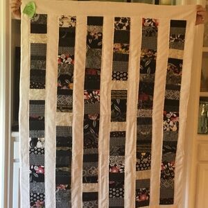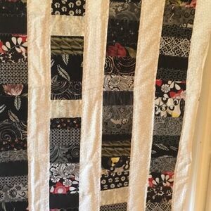 Brand new. Black and White and a touch of Red! This is known as as “coin” quilt and features botanical and geometric prints highlighted by all white borders.