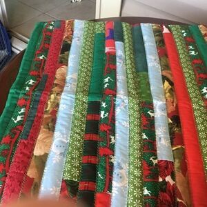 Handmade Quilted Holiday Runner works on tables, mantels, or even dressers helping to decorate your room. This one is a mix of holiday prints, primarily red and green and measures 18 1/2” wide x 22” in length.