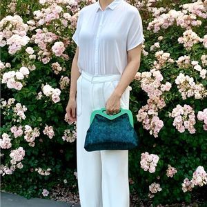 One of a kind. Stylish design. Made from very special hair-on-calf hide, glitter pattern printed. This wooden frame bag holds a lot, spacious enough for your phone, large wallet, books, compact umbrella, cosmetics & other items.