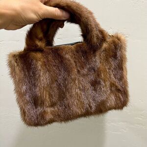 One of a kind! Brand new. This gorgeous small satchel bag is handmade from natural Muskrat fur, with fur handles. Includes removable beautiful mink fur flower keychain/bag charm.