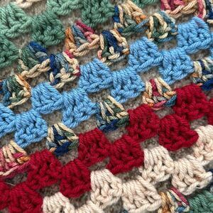 An array of knit squares knit together to form a beautiful afghan. Has a retro pattern.