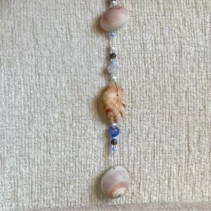 This is handmade with shells and driftwood from the North Carolina coast, as well as blue glass and stone beads.