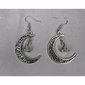 Handmade Silver Dangly Crescent Moon Earrings With Witches Hat