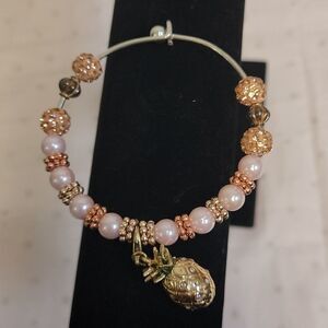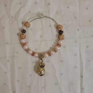 Beautiful colors of pink, rose gold, etc. beads with a gold toned pineapple charm surrounding a wired bracelet. Pineapple has beautiful little rhinestones.