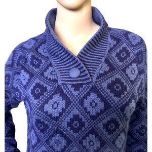 This vintage handmade sweater features an intricate geometric pattern in a rich blue hue. The v-neck design is complemented by a button detail, offering a stylish touch. With its stretchy fabric and round hem, this sweater provides comfort and a flattering fit. Ideal for those seeking a unique, timeless piece.