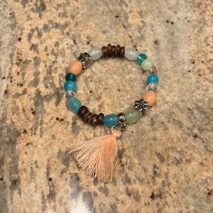 Handmade beaded bracelet. It's super cute and has a peach tassel at the end Length and width 2.5 inches