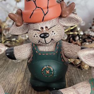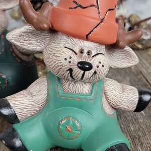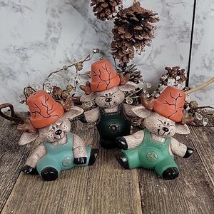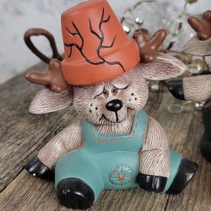 Handpainted with love a cute set of reindeer in coveralls and broken pots as hats. All in great pre-owned condition