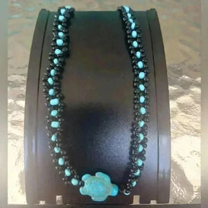 Handmade choker type elastic necklace made with black and Turquoise colored glass beads and a howlite turquoise turtle charm fit with a lobster clasp. See photos for length. Made in Key Largo, Florida.