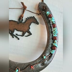 sparkly real horseshoe with turquoise and red mountain turquoise stones and a hanging horse and feather
