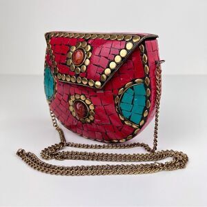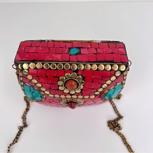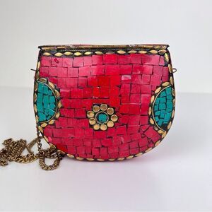 One of a kind handmade bag, inside filled with velvet to complete the ethnic but elegant look, outside made from brass and inlaid of stones, tile stones, mosaic.There might be some imperfections due to the handmade work.
