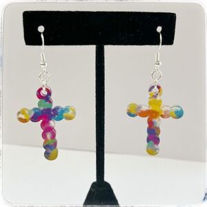 Gorgeous handmade earrings. Brightly colored paint splash pattern on clear acrylic. Style bubble cross. Silver toned hardware. Laser cut and hand assembled by me using hypoallergenic hardware