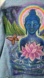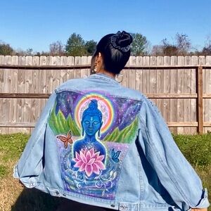Vibrant denim jacket featuring a colorful spiritual Blue Buddha design with magical butterflies and lotus flower scenery. With glitter & rhinestones for extra sparkle & shine 💖 One of a kind, unique wearable piece of art!