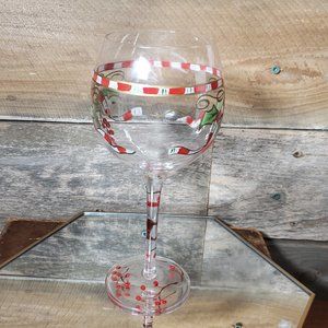 Handpainted Burgundy Wine Glass - Ribbon & Holly. Handpainted holiday design on bowl. Holly berries on the stem and foot. Please view the pictures carefully before purchasing. The bowl measures 4" tall. The Stem is 4 1/2" long. Total height 8 1/2".
