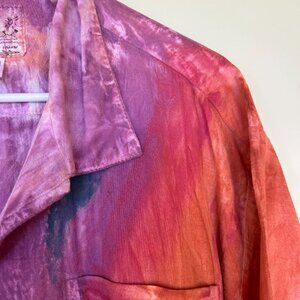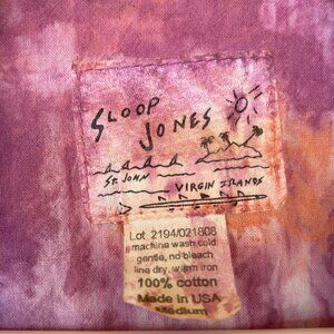 Set your clock to island time. This 100% cotton, button-down, short-sleeve wearable work of art was hand-painted by Sloop Jones, a legendary creator in St. John, US Virgin Islands. Splashed with the colors of a Caribbean sunset (orange, pink, purple, indigo), it's a top that you can't help but feel happy while wearing.