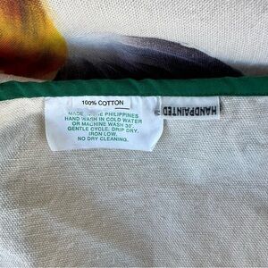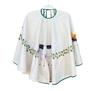 Country Farm Christmas Tree Skirt. 100% cotton, handpainted in the Philippines. Featuring a Cow, roosters and holly leaves and berries. Green binding, tie closure.