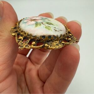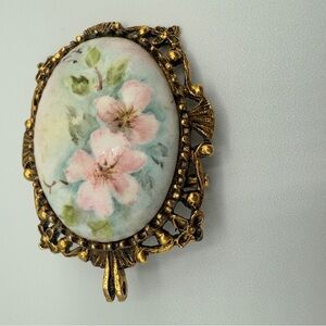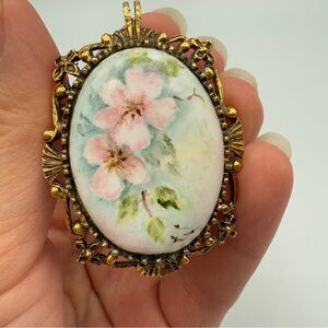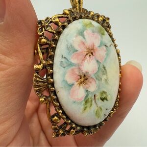 Handpainted Floral Victorian Style Gold tone Vintage Ceramic Pendant / Brooch