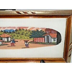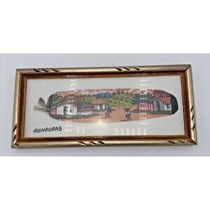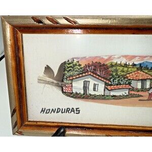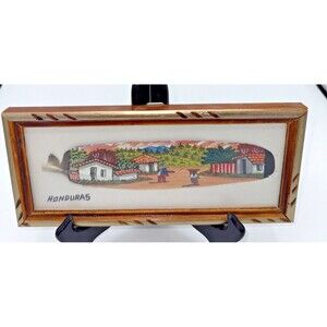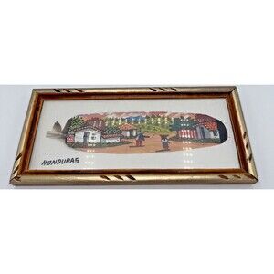 The item is in very good condition, the clear part of the frame is plastic not glass. This handpainted and framed feather art piece depicts a tropical village scene from Honduras, measuring 10.75" x 5". The artwork features acrylic painting technique, making it an original piece. The handcrafted nature of the item adds a unique touch to any wall, perfect for those who appreciate art and handmade décor. The vibrant colors and detailed scene make it a beautiful addition to any home, showcasing the rich cultural heritage of Honduras through art.