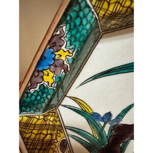 Beautiful vintage Japanese octagonal plate in the Ko-Kutani style — rich colors, hand-painted floral and rock garden scene, and incredible detail!
