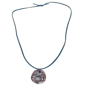 Handpainted Metallic Bow Air Dry Clay Blue Faux Leather Cord Necklace