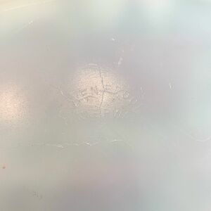 Striking platter trimmed in gold. Painted old mill scene on the front. Some light scratching on the painting-not noticeable at a distance. Painted on milk glass that says “made in the USA” (I have seen others with a “Fire King” backstamp, but this does not say Fire King). There is one spot of clear glue or something on the front (circled in picture). Not for food use.